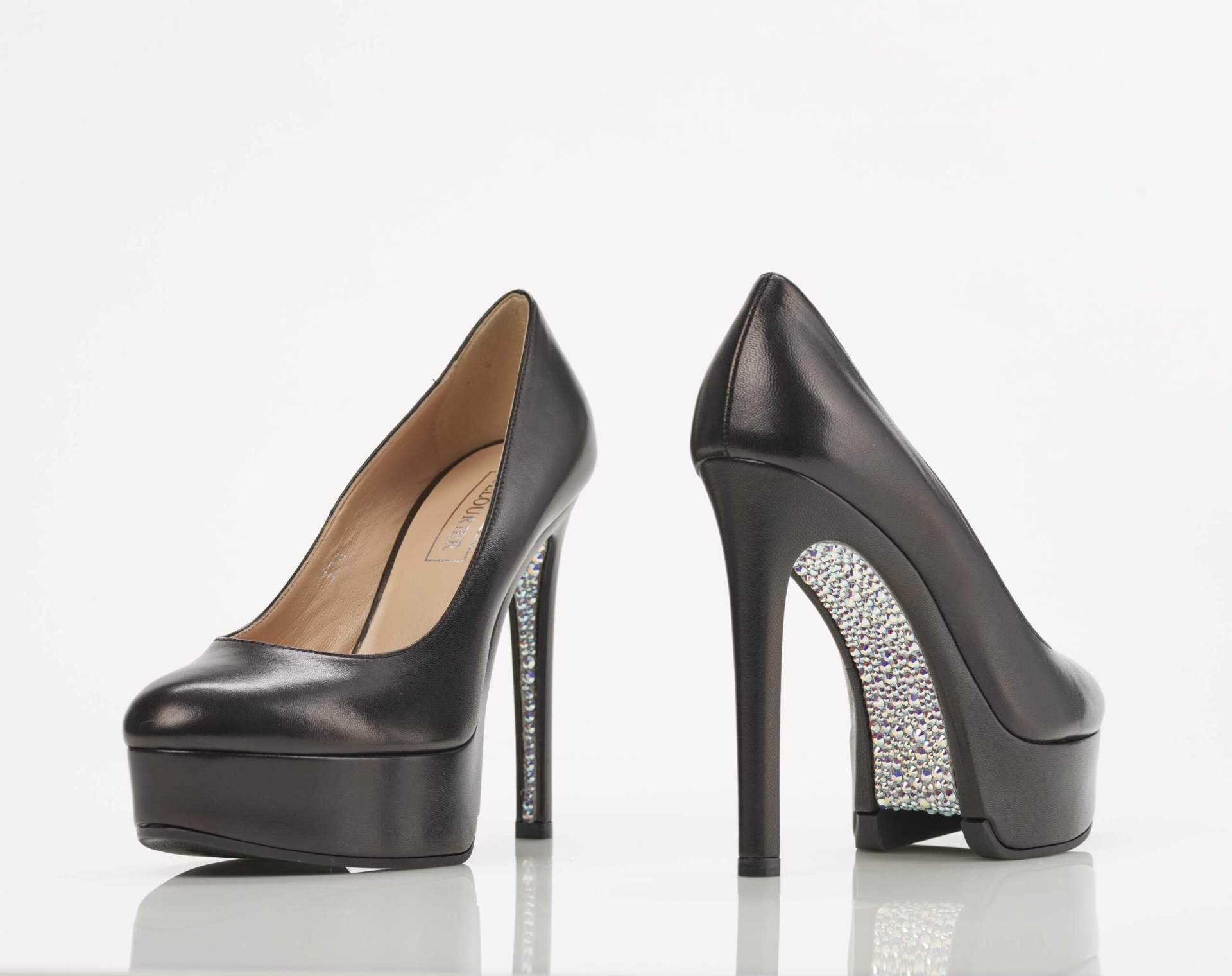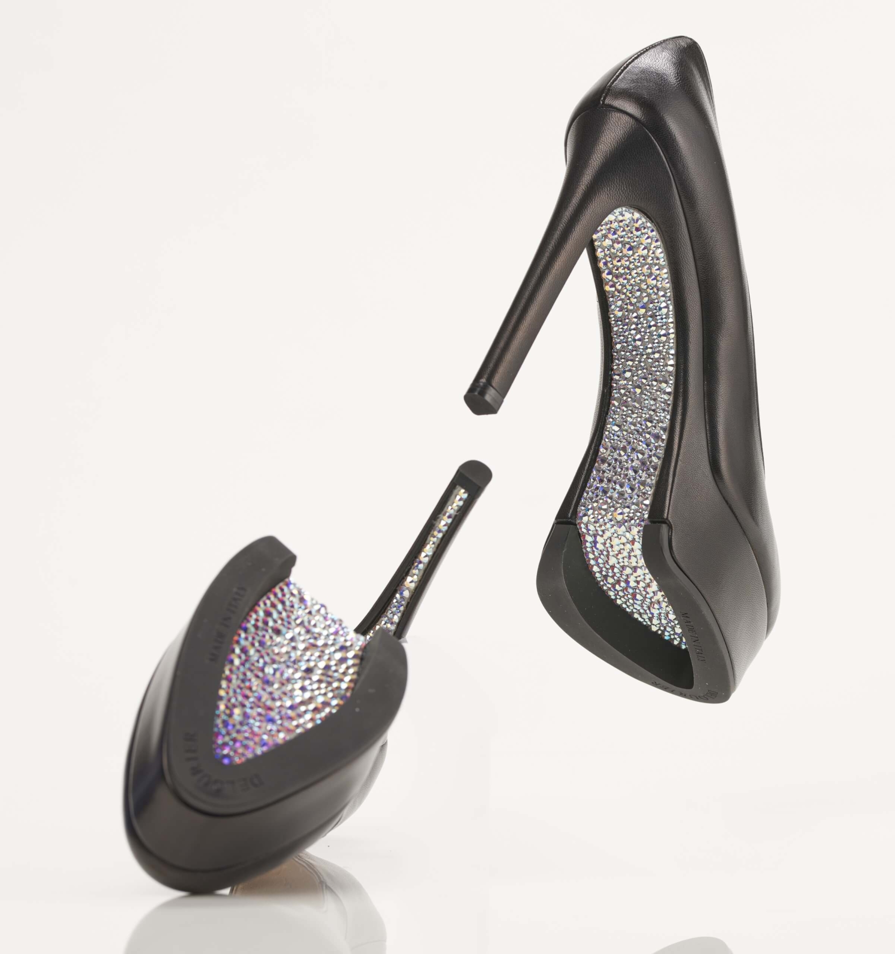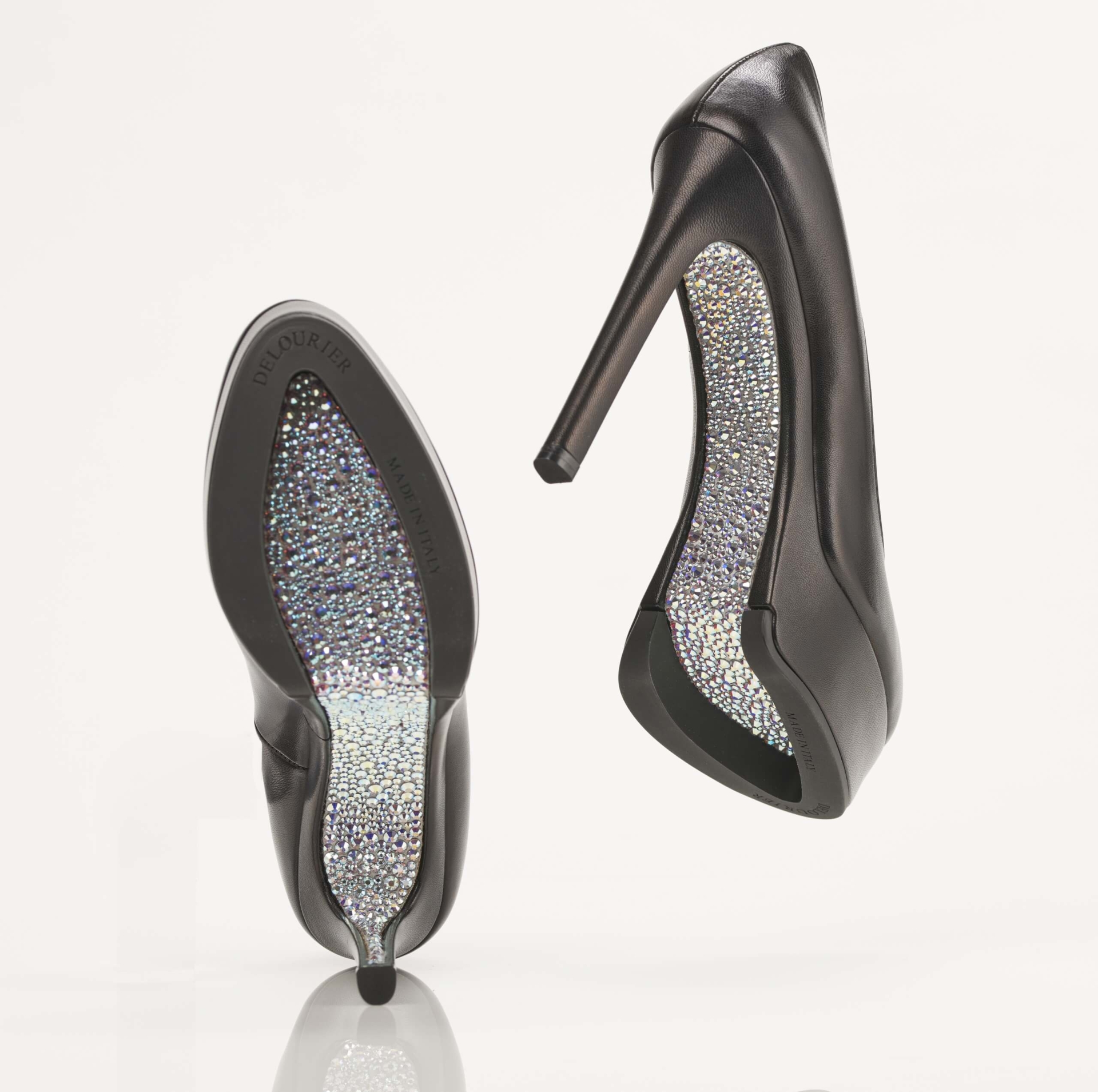Delourier shoes are the first in the world and first-of-its-kind invention that makes it physically possible to embellish the entire surface of the sole ( from the tip of the heel to the tip of the toe) with decorative elements, which never touch the ground.