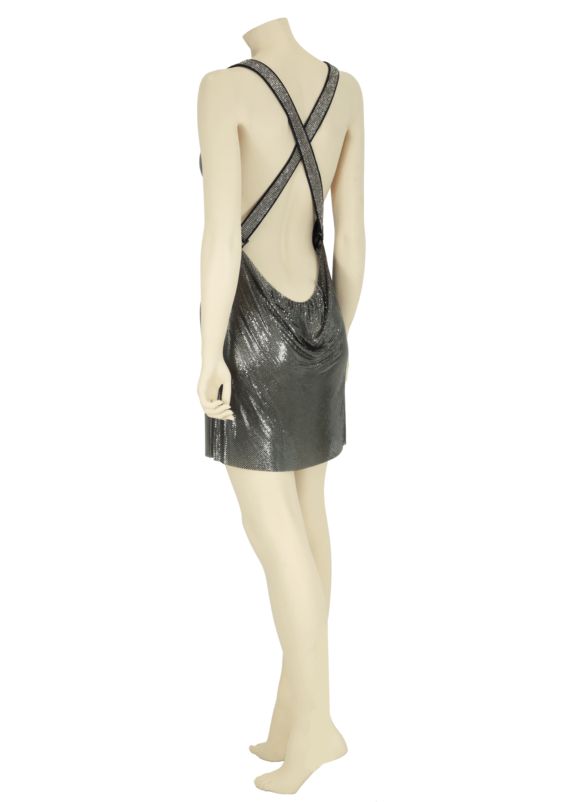 Chainmail dress with cowl draping on the neckline and lower back. It features authentic Swarovski crystal mesh straps, which have been lined in genuine lambskin leather. The entire dress is framed with an elegant black satin piping. The straps and lower back are adjustable.